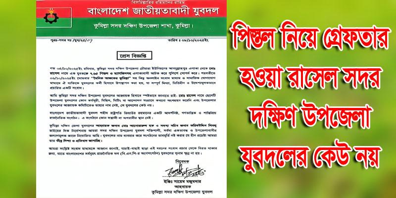 আমি কুমিল্লা সদর দক্ষিণ উপজেলা যুবদলের আহ্বায়ক হিসাবে স্পষ্টভাবে জানাতে চাই, মোঃ রাসেল নামে ছেলেটি উপজেলা যুবদলের কোন কর্মসূচী, মিছিল, মিটিং বা আন্দোলন সংগ্রামে কখনো অংশগ্রহন করেনি এবং উপজেলার যুবদলের আহ্বায়ক কমিটিতেও তাহার নাম নেই, সে যুবদলের কেউ নয় ।